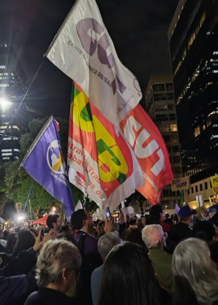 O Sindicato dos Bancários de Niterói e Regiões marcou presença, nesta quinta-feira, na manifestação que reuniu milhares de trabalhadoras e trabalhadores no Centro do Rio.