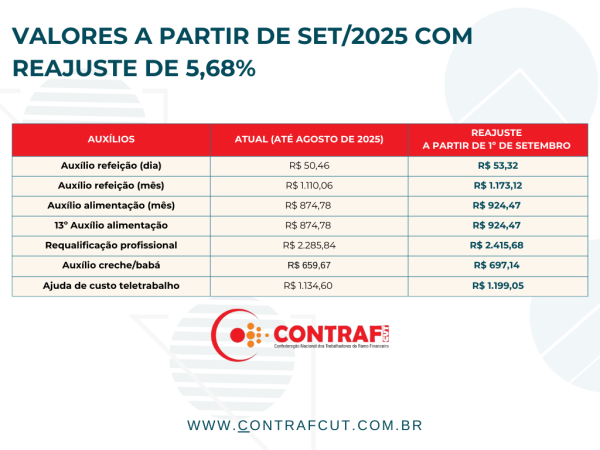 Bancárias e bancários terão reajuste de 5,68% sobre o salário e todas as demais verbas, incluindo a Participação nos Lucros e Resultados (PLR), vale-refeição e vale-alimentação.