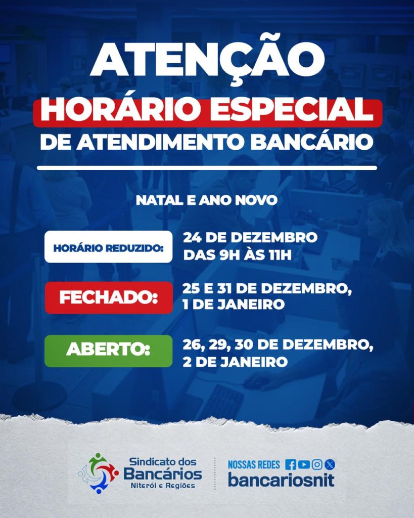 O expediente bancário, neste final de 2025, seguirá a orientação padrão da Febraban e do Banco Central. No dia 24/12, véspera de Natal, o horário será reduzido, com expediente de 9h às 11h.