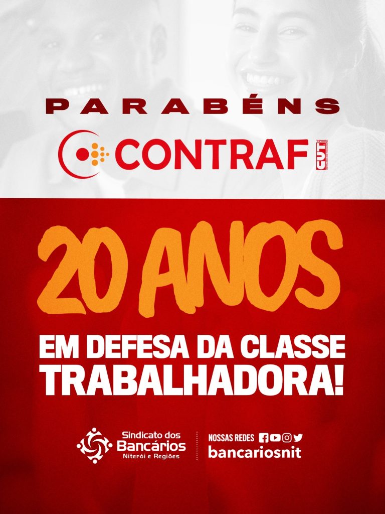 O Sindicato dos Bancários de Niterói e Regiões parabeniza a Confederação Nacional dos Trabalhadores do Ramo Financeiro (Contraf-CUT), que celebra 20 anos de existência, nesta segunda-feira, 26 de janeiro.