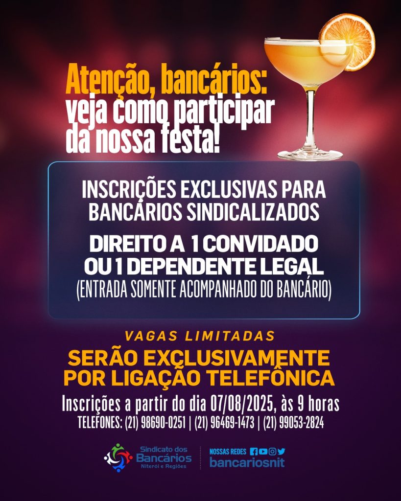Na Festa do Bancário, que será realizada no próximo dia 15/8, o bancário sindicalizado poderá levar um dependente legal ou um convidado.