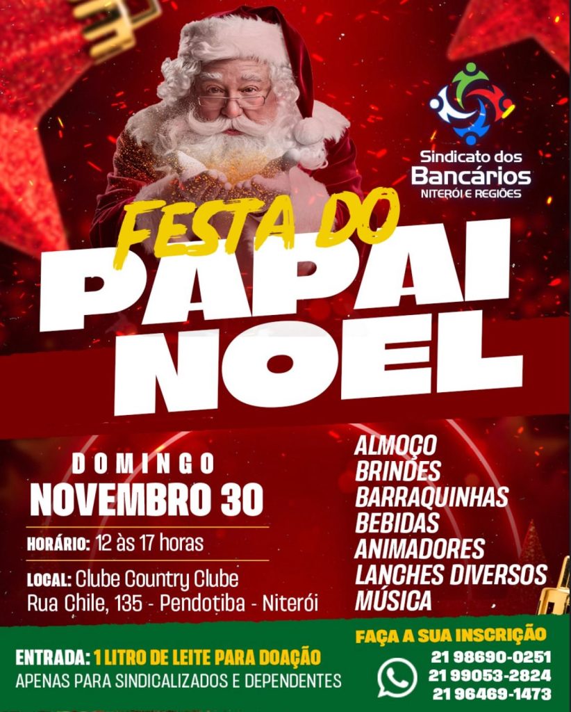 O Sindicato dos Bancários de Niterói e Regiões realiza sua Festa do Papai Noel, no próximo dia 30 de novembro, das 12h às 17h, no Country Clube, em Pendotiba.