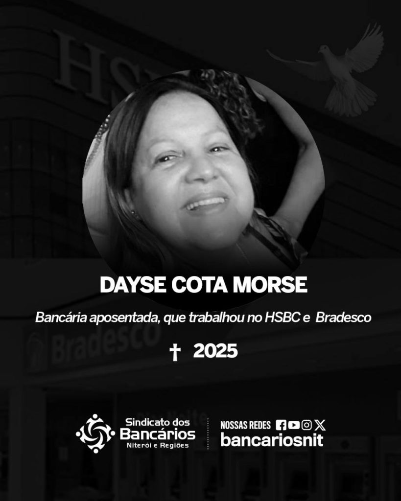 O Sindicato dos Bancários de Niterói e Regiões lamenta o falecimento de Dayse Cota Morse, bancária aposentada, que trabalhou no HSBC e na agência do Bradesco, no Barreto, que foi fechada.