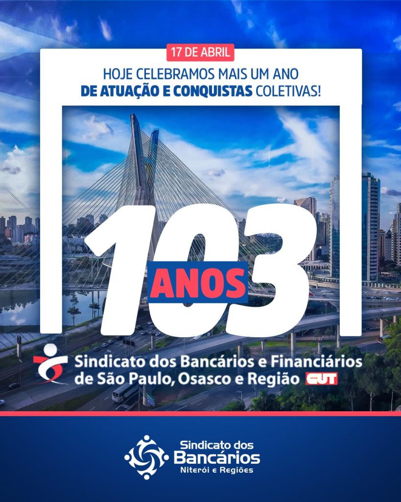 O Sindicato dos Bancários de Niterói e Regiões parabeniza o Sindicato dos Bancários e Financiários de São Paulo, Osasco e Região, que está comemorando 103 anos de luta em prol da categoria bancária.