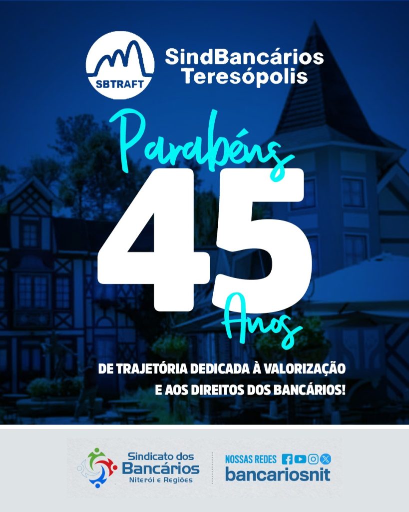O Sindicato dos Bancários de Niterói e Regiões parabeniza o Sindicato dos Bancários de Teresópolis e seu presidente Claudio Melo, pelo 45 anos de lutas em prol dos trabalhadores.