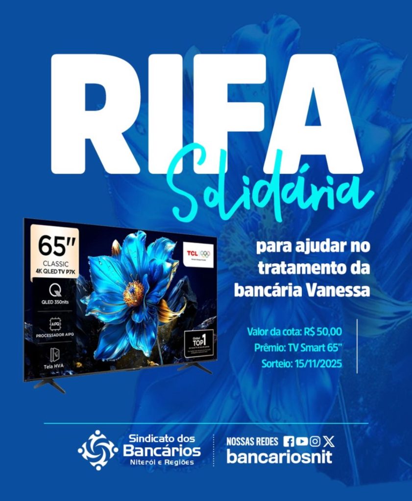 O valor de cada número é R$ 50 e o prêmio é uma TV Smart 65. O sorteio será no dia 15 de novembro de 2025.