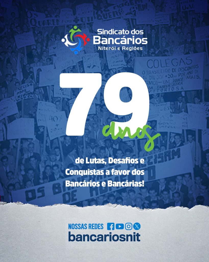 O Sindicato dos Bancários de Niterói e Regiões está completando 79 anos, nesta sexta-feira (5). São mais de sete décadas de lutas, desafios e conquistas, garantindo melhores condições de vida e trabalho para a categoria.