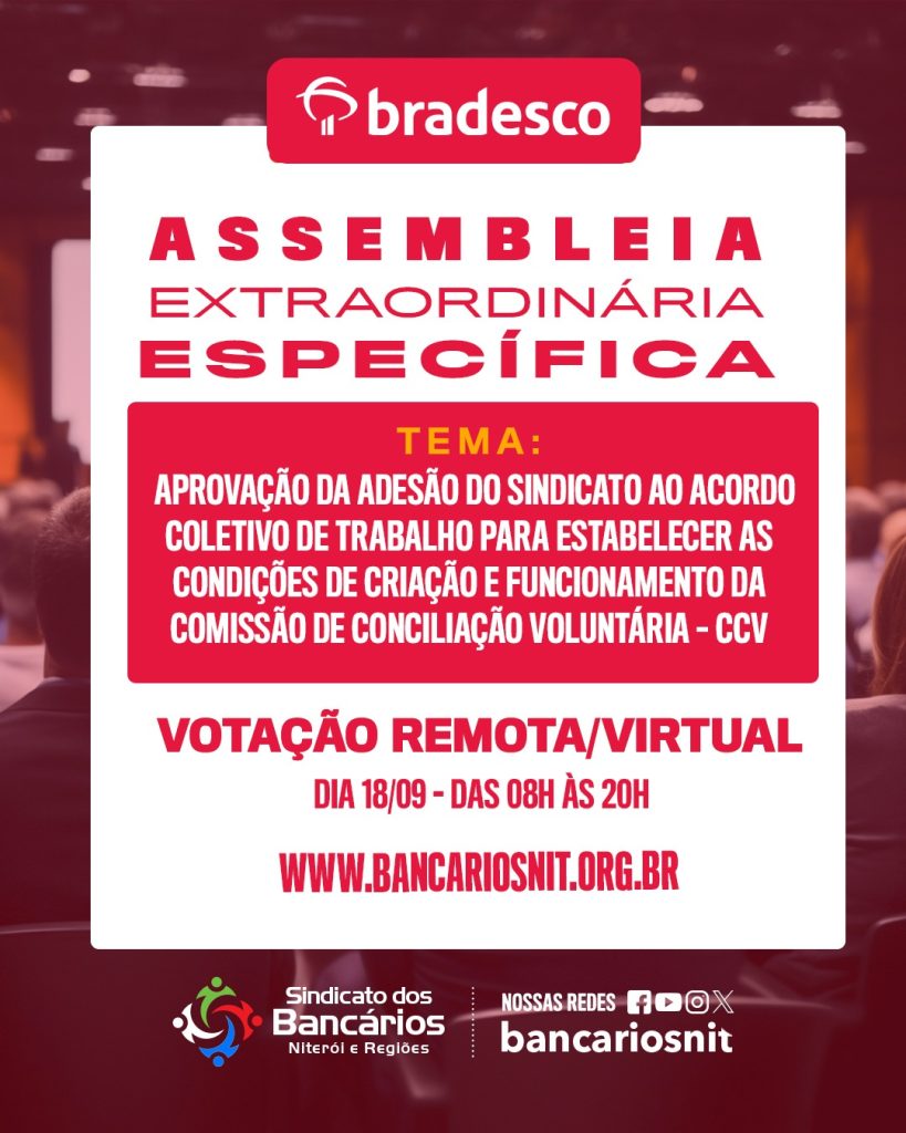 O Sindicato dos Bancários de Niterói e Regiões convoca os empregados do Banco Bradesco S/A, Bando Bradesco Financiamentos S/A, Banco Bradesco BBI S/A e Banco Bradesco Bradescard S/A, sócios e não sócios, de sua base territorial, para a Assembleia Extraordinária Específica, que será realizada no dia 18 de setembro, das 8h às 20h, de forma virtual/remota/eletrônica.
