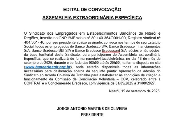 Sindicato convoca para assembleia do Bradesco