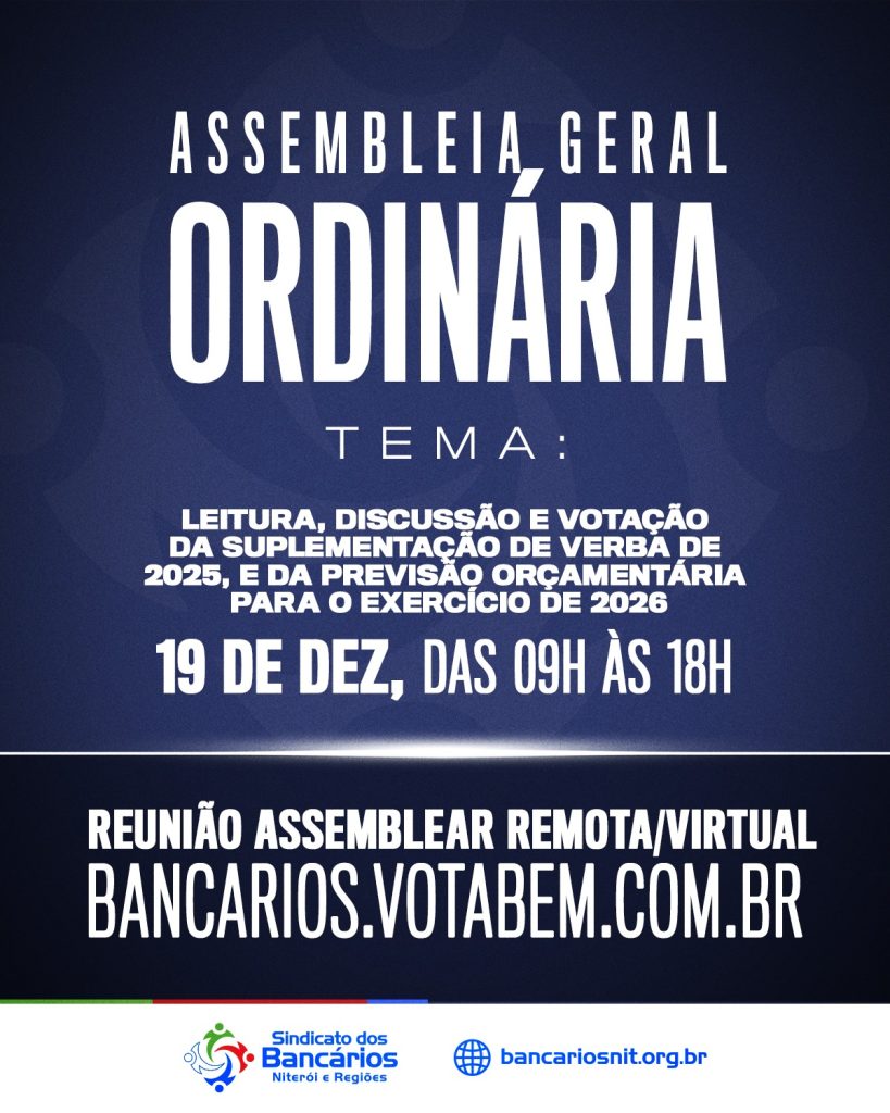 O Sindicato dos Bancários de Niterói e Regiões está convocando todos associados quites, da sua base territorial, para participarem da Assembleia Geral Ordinária, no próximo dia 19 de dezembro.