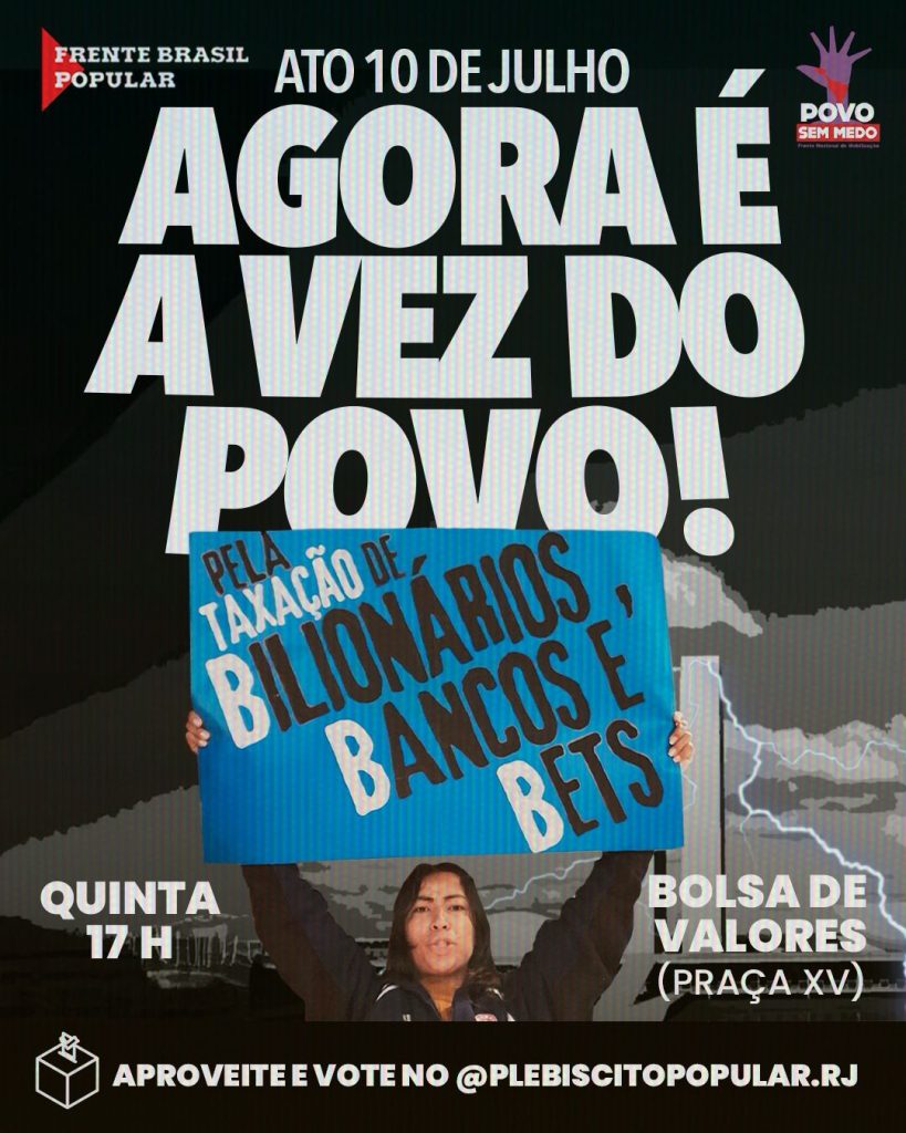Nesta quinta-feira será realizado um grande manifesto pela taxação dos super-ricos, bancos e bets, isenção de Imposto de Renda para quem ganha até R$ 5 mil e pelo fim da escala 6×1.